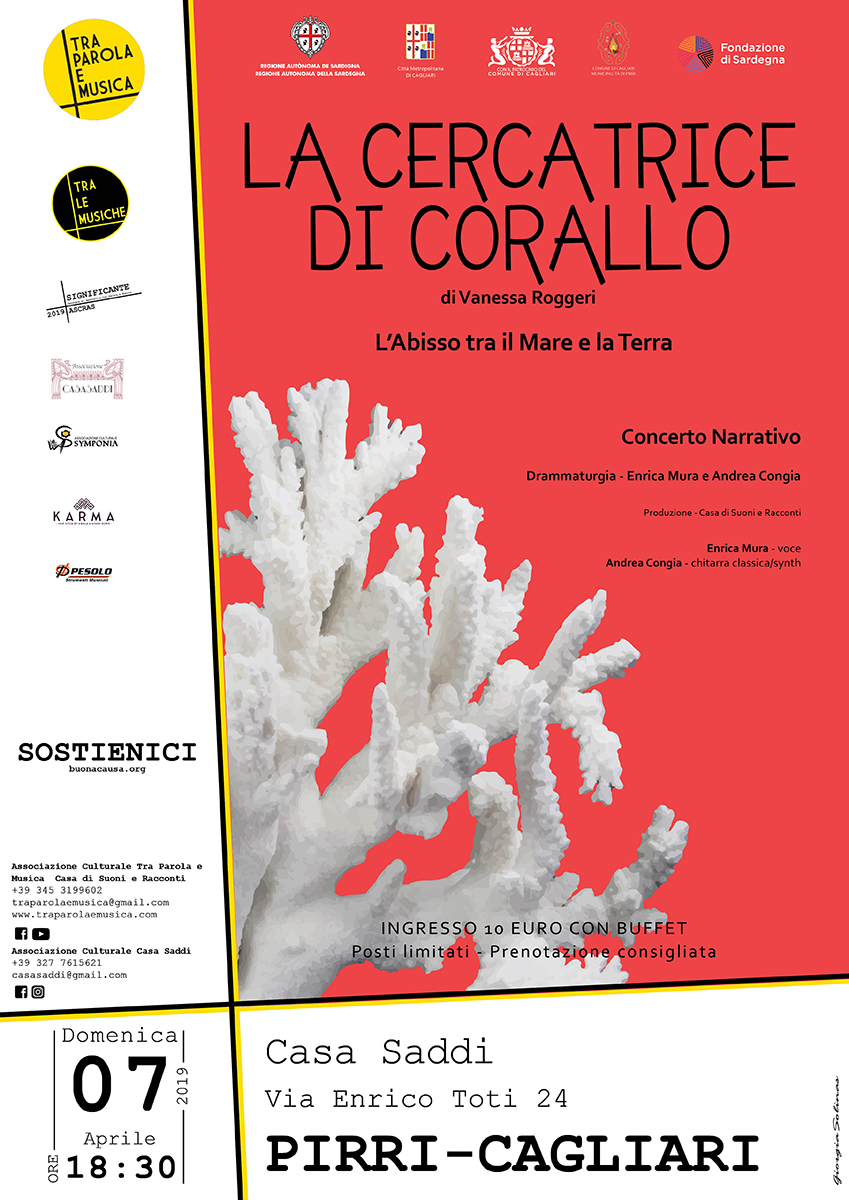 Il programma cagliaritano della Rassegna di Spettacolo tra Parola e Musica Significante 2019 – ASCRAS termina con un appuntamento tutto dedicato al Mare. Domenica 7 Aprile 2019 alle ore 18:30 a Casa Saddi, a Cagliari (Via Enrico Toti 24 – Pirri), l’attrice Enrica Mura e il chitarrista Andrea Congia, insieme sul palco, trasformeranno l’ultimo romanzo di Vanessa Roggeri in un Concerto Narrativo. La Cercatrice di Corallo è una storia che presenta tutti i colori dei sentimenti umani. Un racconto complesso e variopinto, ricco di ritratti caratterizzanti e scenari suggestivi di una Sardegna Letteraria sospesa tra Terra e Mare. L’ultimo lavoro dell’Autrice non può essere ridotto a una semplice storia d’amore tra due ragazzi: moti d’animo travolgono i personaggi fino al compimento di un Destino inesorabile, il lettore viene così trasportato in una policroma avventura nella quale si succedono Rivalsa, Vendetta e Salvezza e tutto si svolge intorno all’importante simbolo del Corallo.