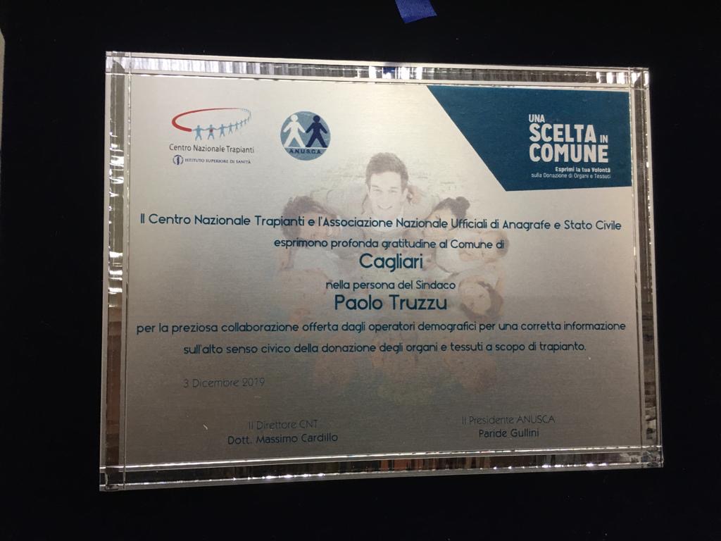 “Il Centro Nazionale Trapianti e l’Associazione Nazionale Ufficiali di Anagrafe e Stato Civile esprimono profonda gratitudine al Comune di Cagliari, nella persona del sindaco Paolo Truzzu, per la preziosa collaborazione offerta dagli operatori demografici per una corretta informazione sull’alto senso civico della donazione degli organi e tessuti a scopo di trapianto”.
