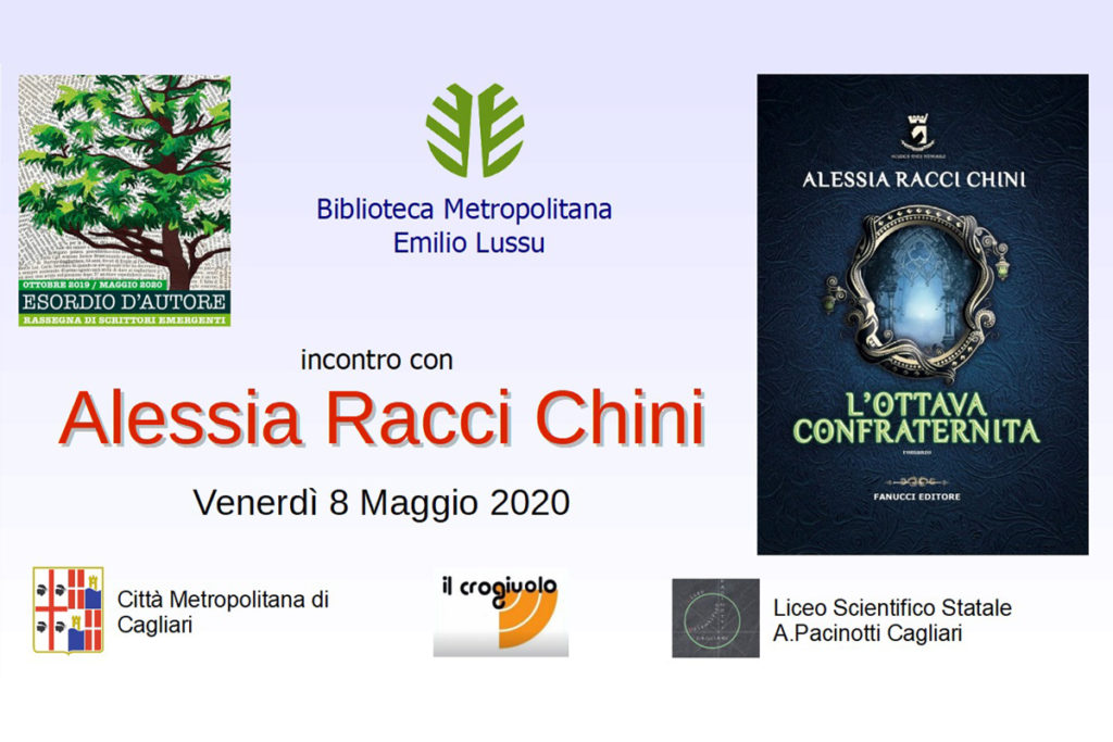 Venerdì 8 maggio 2020 alle ore 17, in diretta sul sito web (LINK) e sulla pagina Facebook live del Sistema Bibliotecario di Monte Claro di Cagliari, l’ottavo e ultimo incontro del ciclo di appuntamenti intitolato “Esordio d’autore – Rassegna di Scrittori Emergenti”. Sarà ospite l’autrice Alessia Racci Chini per parlare del suo libro d’esordio “L’ottava confraternita”, Fanucci Editore.