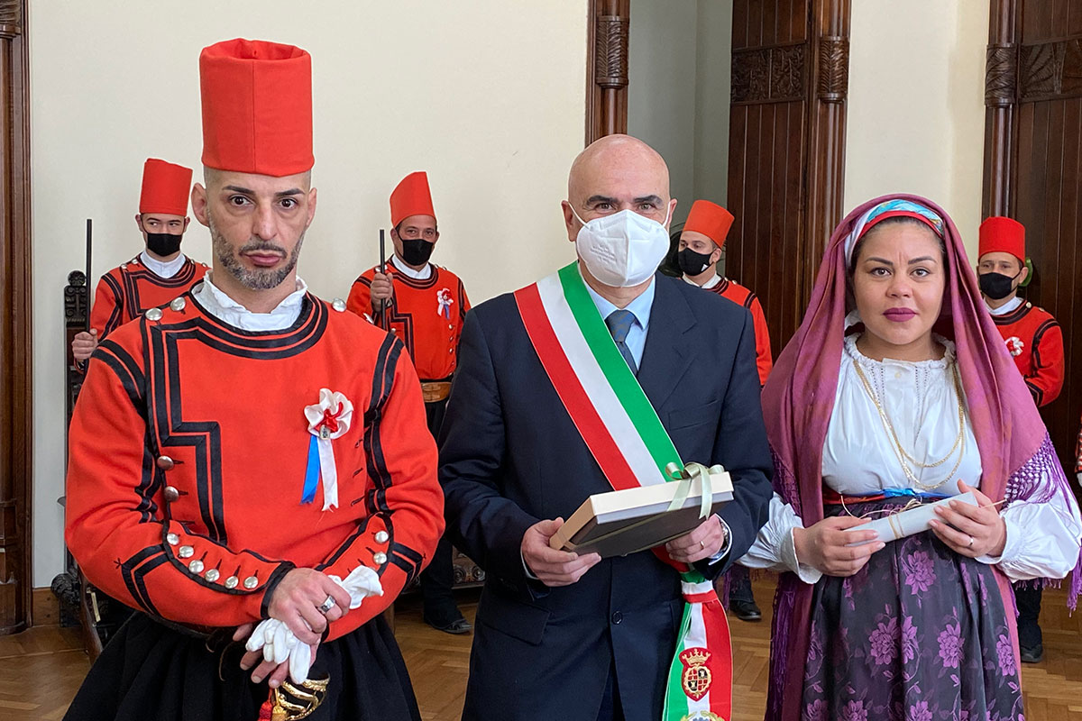 Cagliari. La Sala Matrimoni al secondo piano del Palazzo Civico di Cagliari è stata lo scenario del Matrimonio in Divisa da Miliziano di Sant’Efisio celebrato nella mattina di ieri, venerdì 12 marzo 2021, dall’Assessore alle Attività Produttive e Turismo, Alessandro Sorgia.