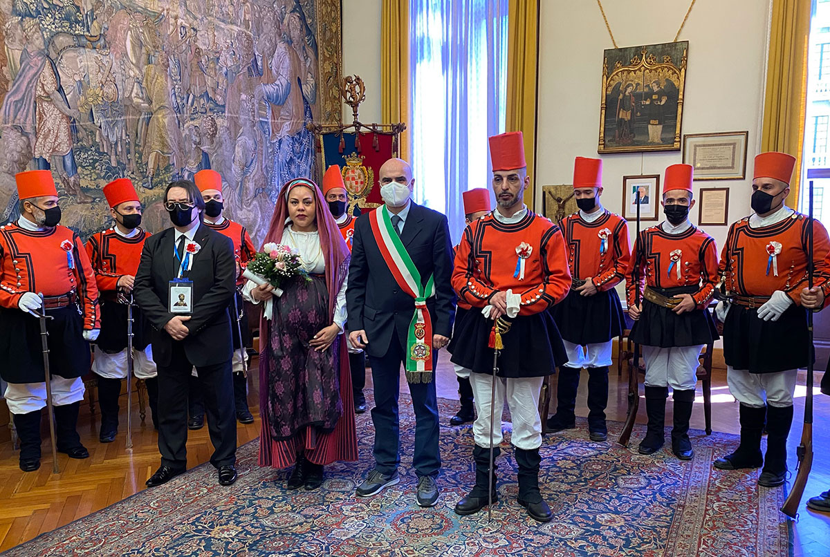Cagliari. La Sala Matrimoni al secondo piano del Palazzo Civico di Cagliari è stata lo scenario del Matrimonio in Divisa da Miliziano di Sant’Efisio celebrato nella mattina di ieri, venerdì 12 marzo 2021, dall’Assessore alle Attività Produttive e Turismo, Alessandro Sorgia.