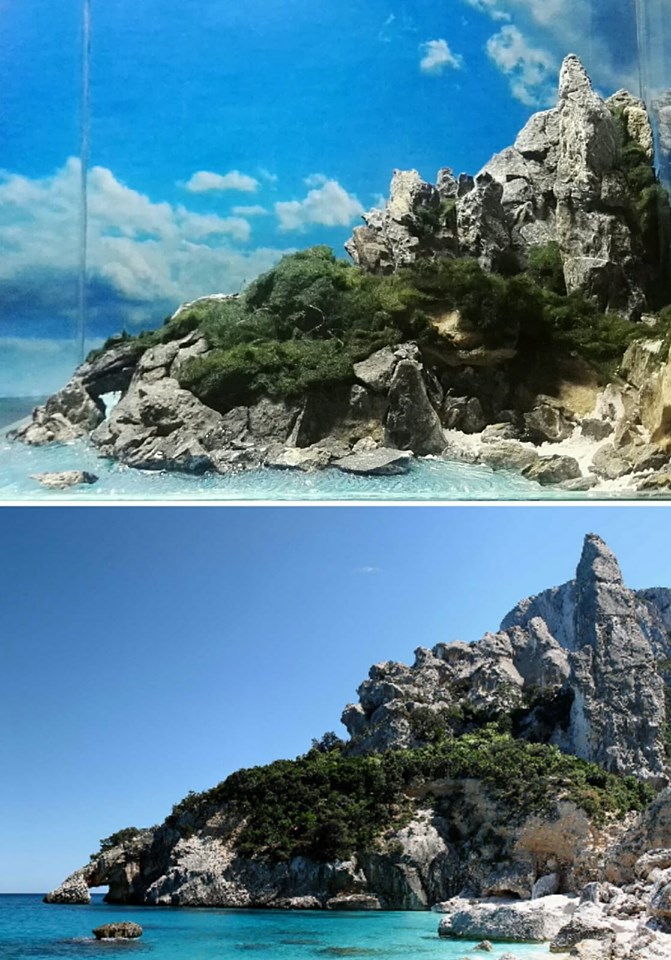 “La mostra Immortal Landscapes vede esposti 7 acquari realizzati da Renzo Perra, dove piante e rocce, sapientemente organizzate e disposte, ricreano paesaggi celebri delle coste sarde.