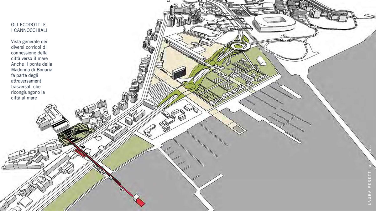 Il progetto parte dalla messa a sistema delle macroaree costituite dalla Fiera e dal Porto, nella parte in prossimità del Padiglione Nervi, ricollegando al contempo la parte residenziale, arretrata rispetto al mare, rimagliando il sistema del lungomare con la città.