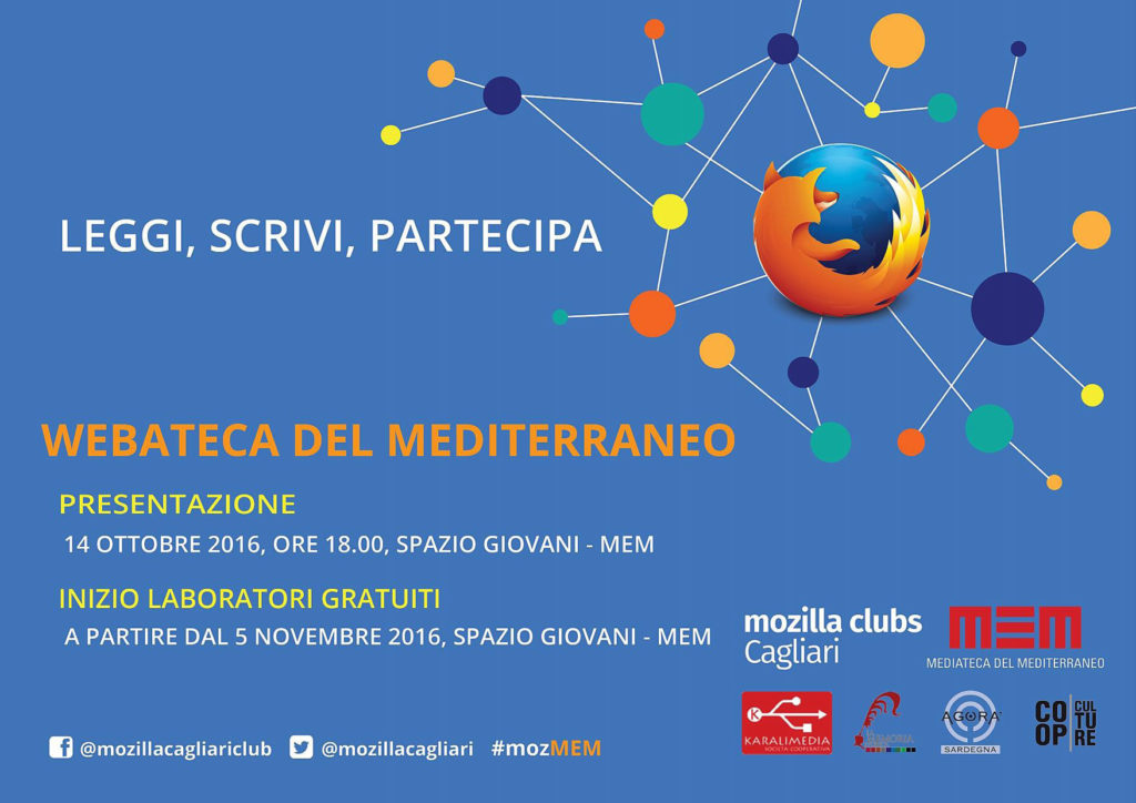 Venerdì 14 ottobre alle ore 18.00 nello Spazio Giovani al piano terra della MEM Mediateca del Mediterraneo, sarà presentata la Webateca del Mediterraneo, a cura del Mozilla Cagliari Club e della MEM.