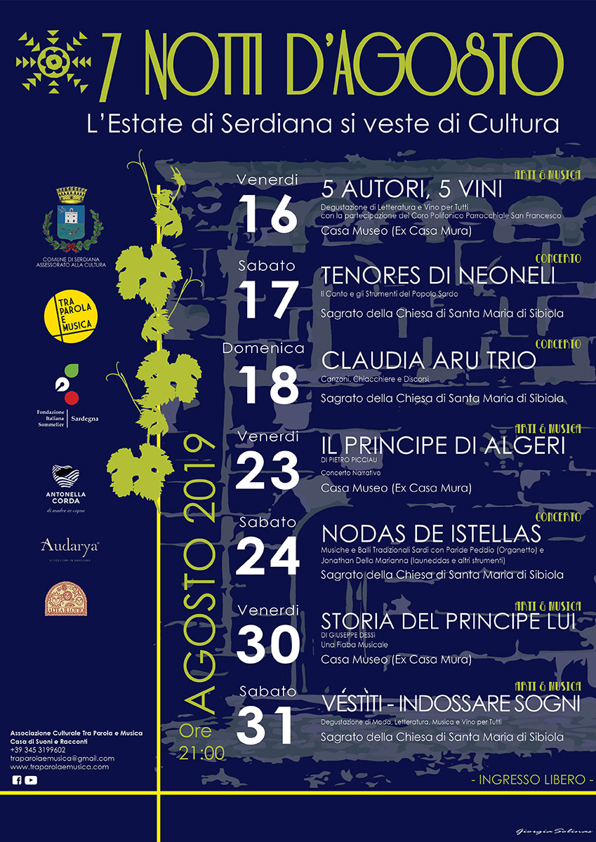 Sono sette gli appuntamenti della Rassegna Culturale (nei fine settimana: dal 16 al 31 agosto), diretta dal musicista Andrea Congia. Performance teatrali, narrative, letterarie, di danza e moda, accompagnate da una colonna sonora eseguita dal vivo. Gli eventi, a connotazione identitaria, rafforzata da una commistione di più linguaggi artistici, saranno caratterizzati dalla prossimità tra artisti e pubblico. Niente palco: sarà questa la prerogativa di ogni appuntamento, con lo scopo di creare un coinvolgimento diretto. Scambio reciproco ulteriormente rafforzato da momenti conviviali di buffet e degustazione, allestiti dopo o durante alcuni spettacoli. Un’occasione imperdibile d’incontro tra tutti i partecipanti, artisti e pubblico, nelle calde serate estive, in cui saranno presenti anche le cantine locali, e non solo, per un connubio immancabile tra Vino e Cultura attraverso il coinvolgimento di più canali sensoriali.