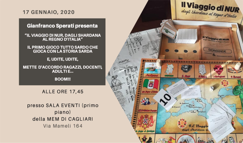 La MEM – Mediateca del Mediterraneo di via Mameli 164 a Cagliari ospiterà, venerdì 17 gennaio 2020 alle 17:45, la presentazione del libro/gioco di Gianfranco Sperati “Il viaggio di Nur, dagli Shardana al Regno d’Italia”.