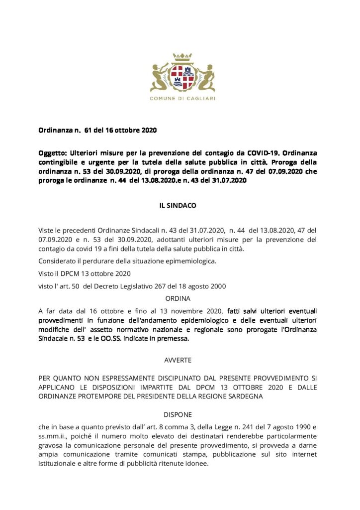 Il sindaco Paolo Truzzu con propria Ordinanza n. 61 del 16.10.2020, ha disposto che a far data dal 16 ottobre e fino al 13 novembre 2020, fatti salvi ulteriori eventuali provvedimenti in funzione dell’andamento epidemiologico e delle eventuali ulteriori modifiche dell’assetto normativo nazionale e regionale, sono prorogate l’Ordinanza Sindacale n. 53 del 30.09.2020 e le precedenti ordinanze di proroga ( n. 47 del 07.09.2020 che proroga le ordinanze n. 44 del 13.08.2020 e n. 43 del 31.07.2020)