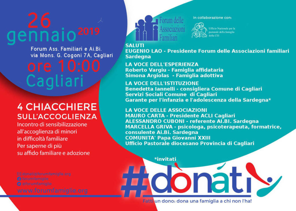 Il Programma. Dopo i saluti del presidente del Forum delle Associazioni Familiari Sardegna Eugenio Lao, il programma prevede diverse fasi di confronto: La voce dell’esperienza con le testimonianze di alcune famiglie affidatarie e adottive, e La voce dell’istituzione che prevede gli interventi della consigliera comunale di Cagliari Benedetta Iannelli, di rappresentanti dei Servizi Sociali del Comune di Cagliari, del Garante per l’infanzia e l’adolescenza della Sardegna e del Garante della Citta Metropolitana di Cagliari. Chiuderà l’evento la sezione dedicata alla Voce delle associazioni con gli interventi del presidente delle Acli Cagliari Mauro Carta, del referente Ai.Bi. Sardegna Alessandro Cuboni, della psicologa e consulente Ai.Bi. Sardegna Marcella Griva, e di rappresentanti della Comunità Papa Giovanni XXIII e dell’Ufficio Pastorale diocesano provinciale.