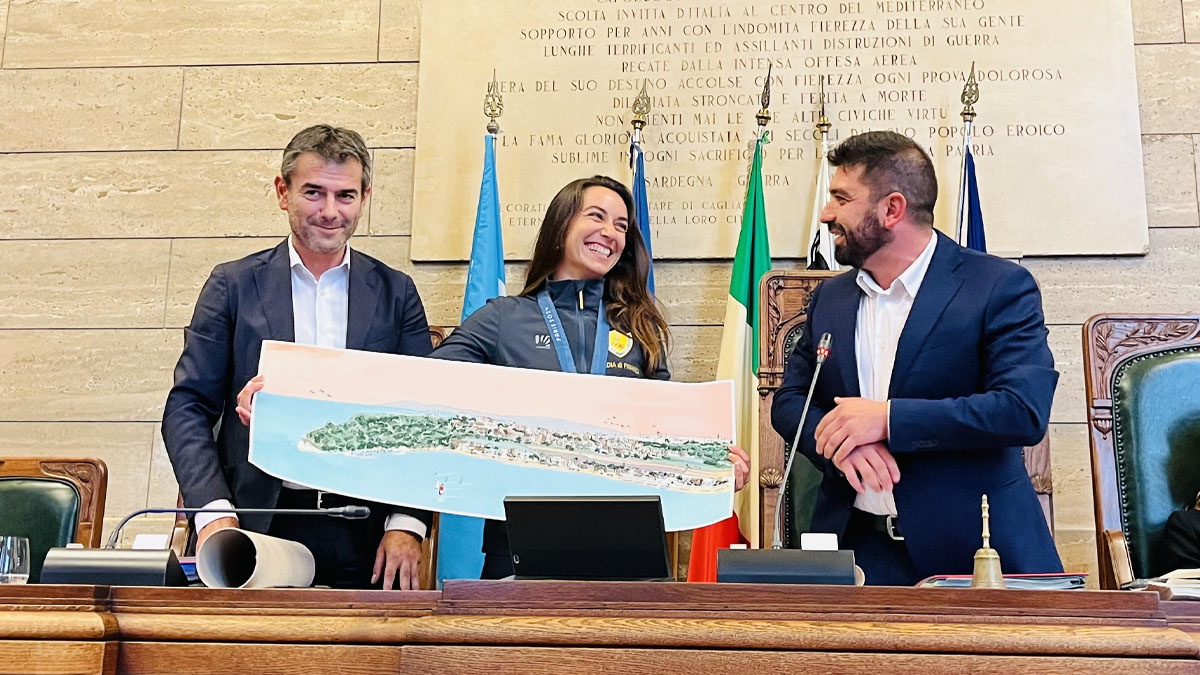 A consegnare alla campionessa cagliaritana una pergamena ricordo con dedica e una stampa con skyline del Poetto con i windsurf che veleggiano in mare, sono stati il sindaco Massimo Zedda e il presidente Marco Benucci alla presenza del Consiglio comunale e di autorità.