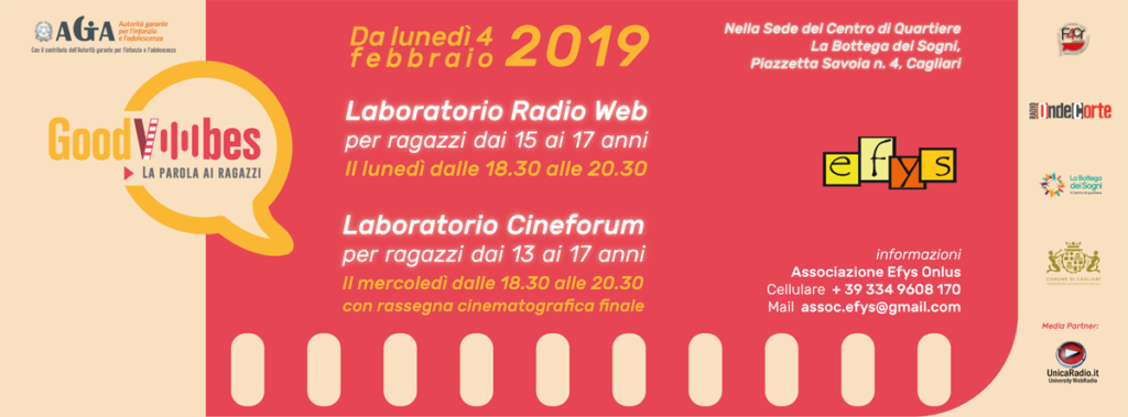 Parte il 4 febbraio il nuovo progetto dell’Associazione Efys Onlus realizzato in collaborazione con F4CR (Fight for Children’s Rights) e la cooperativa sociale Il Giardino di Clara / Typos e Radio Onde Corte. Il progetto, realizzato con il contributo dell’Autorità garante per l’infanzia e l’adolescenza, è finalizzato a promuovere e stimolare la cittadinanza attiva, la partecipazione e la libera espressione dei ragazzi. “Good Vibes: la parola ai ragazzi” si articola in un laboratorio di Radio Web e uno di Cineforum, dedicati rispettivamente a ragazzi tra i 15 e i 17 anni e tra i 13 e 17 anni e una rassegna cinematografica finale interamente organizzata e curata dai partecipanti.