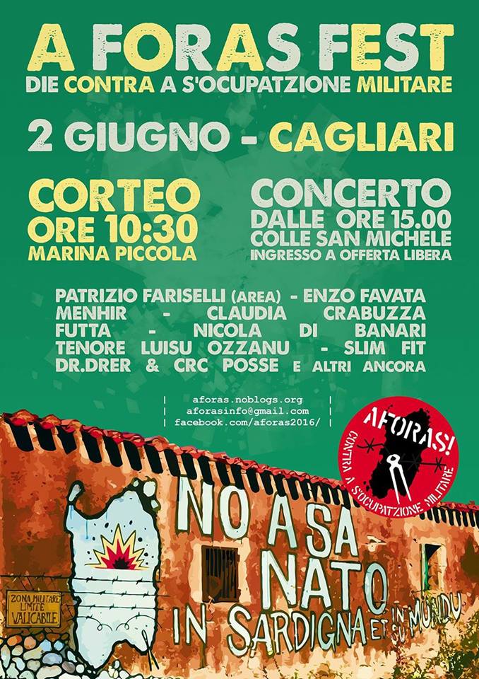 Venerdì 2 giugno, a un anno esatto dalla nascita di A Foras, si vuole capovolgere la festa della repubblica italiana e farne una giornata nella quale il popolo sardo lancia un grido contro quello stesso Stato che ha imposto unilateralmente il 66% di servitù militari dell’intero territorio italiano sulla Sardegna. Un grido contro lo Stato italiano, la NATO, gli altri eserciti stranieri e le multinazionali che operano ogni giorno nella nostra terra per trarre profitto dall’industria bellica.