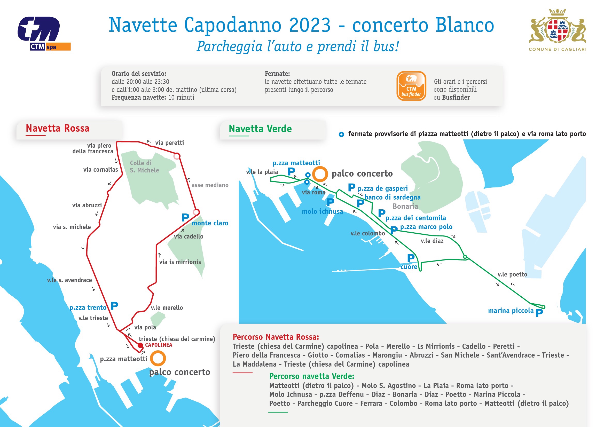 “Ctm attiverà le Navette con una frequenza di 10 minuti, che permetteranno di arrivare nelle vicinanze del palco, senza utilizzare le vetture private. Il percorso – ha evidenziato – è stato studiato per permettere alle persone di lasciare le macchine negli spazi dedicati ai parcheggi e muoversi comodamente in bus. Per garantire la sicurezza a bordo saranno presenti le guardie giurate”.