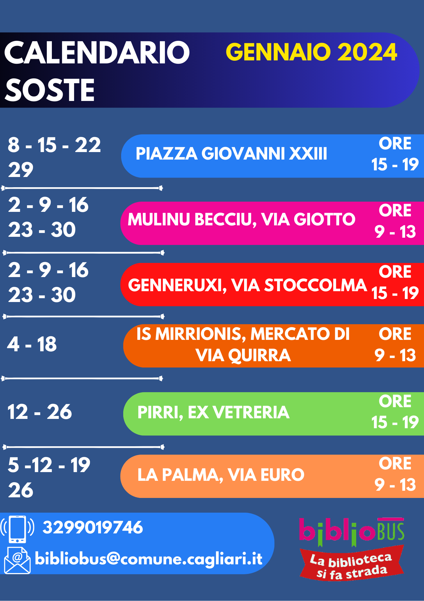 Cagliari. Con l’obiettivo di promuovere la lettura e favorire l’accesso all’informazione attraverso la consultazione e il prestito di libri, anche nel 2024 il Bibliobus, la biblioteca mobile di Cagliari, prosegue il suo tour cittadino. Questo il calendario per il mese di gennaio: