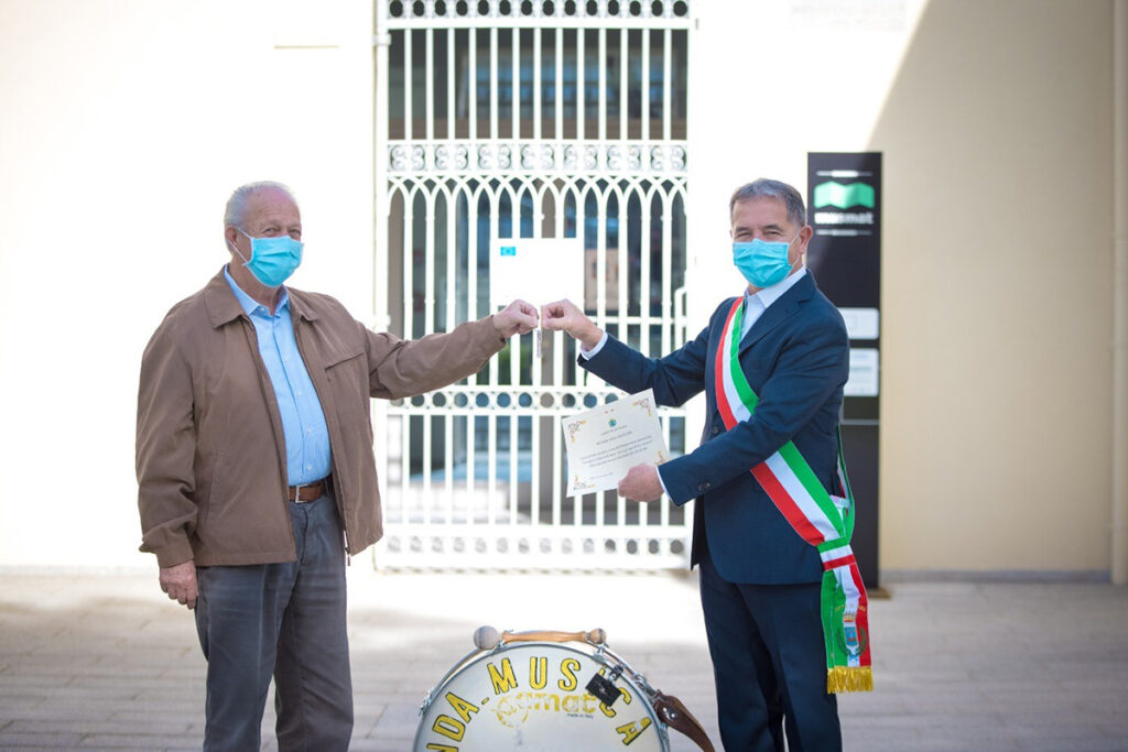 “Con profonda emozione, a nome dell’amministrazione comunale tutta, consegno le chiavi della nuova sede, con gli auguri di vero cuore per il futuro percorso della banda musicale della Città di Olbia”. Queste le parole impresse sulla pergamena firmata dal sindaco Settimo Nizzi che, ieri mattina, ha consegnato le chiavi del MusMat a Franco Demontis, presidente della banda musicale “Felicino Mibelli”.