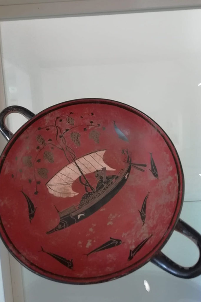 “Si tratta di una mostra didattica, composta da pannelli esplicativi e che utilizza copie di reperti di grande valore archeologico, che sarebbe impossibile portare in formato originale – spiega l’archeologo Franco Campus -. Partiamo dalla coppa decorata a figure nere da Exekias attorno al 540 a.C. e oggi conservata a Monaco di Baviera, nel museo Antikensammlungen: la “Kylix di Dioniso”. La scena rappresentata vede il dio dell’ebbrezza mentre viaggia sulla sua barca a vela verso le coste dell’Attica. I pirati tirreni che volevano ridurlo in schiavitù, spaventati dalla metamorfosi dell’albero della nave in vite, si gettano in mare trasformandosi in delfini”.