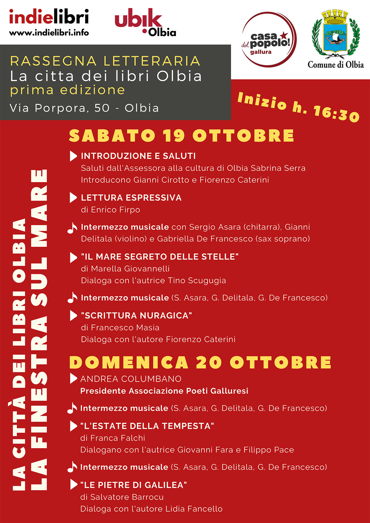 Sabato 19 ottobre e domenica 20 ottobre alle ore 16:30 presso la Casa del Popolo Gallura di Olbia, in Via Porpora 50, la prima edizione della Rassegna letteraria La città dei libri Olbia “La finestra sul mare”.