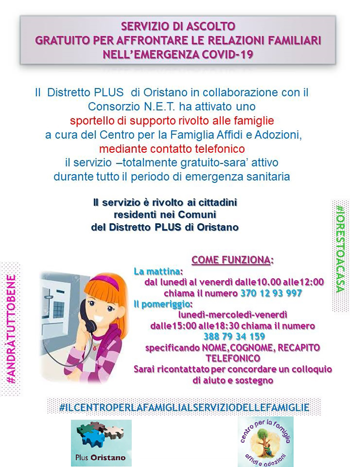 Lo ha istituito il PLUS di Oristano in collaborazione con l’Assessorato ai Servizi sociali del Comune di Oristano, il Consorzio NET ed il Centro per la famiglia gli affidi e le adozioni ed è rivolto a tutti i cittadini residenti nei comuni del distretto di Oristano.