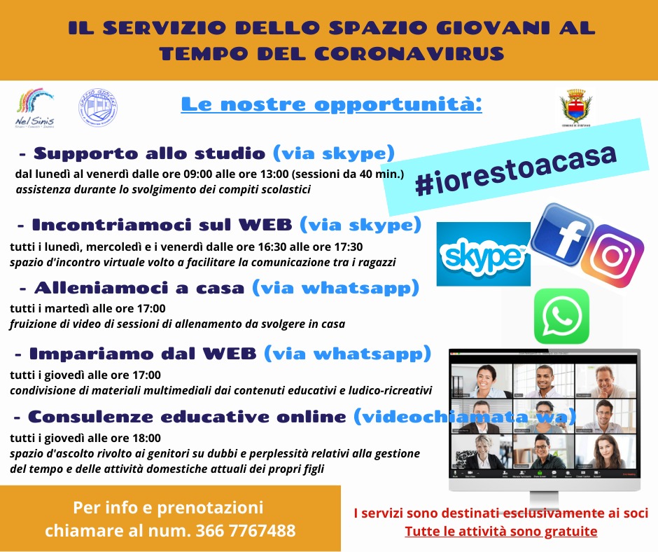 Lo Spazio Giovani anche durante l’emergenza Coronavirus continua a garantire l’attività. Skype, WhatsApp, videochiamate e più in generale il web, attraverso smatrphone, computer e tablet, sono gli strumenti attraverso i quali gli operatori del Centro garantiscono i servizi agli iscritti.