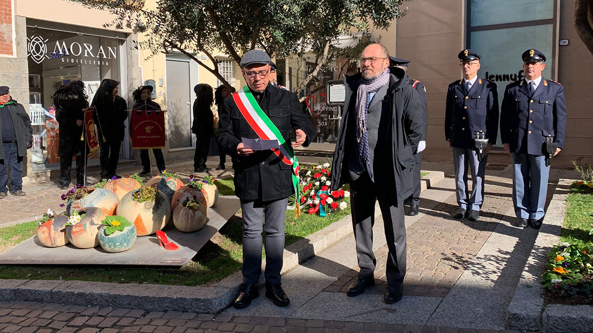 “Siamo qui per riflettere e diffondere la conoscenza di quei tragici eventi. E questo luogo accomuna la volontà di debellare ogni negazionismo, palese, occulto o sottinteso – ha proseguito il Sindaco Sanna -. Indifferenza e noncuranza, infatti, nulla possono dinanzi alla conoscenza della storia e di fronte alle virtù della memoria. Ciò mette in scacco il rancore: ce lo ricordano non solo questo vigoroso ulivo e la ghirlanda che apporremo, ma anche la partecipazione delle autorità, delle Istituzioni e delle Associazioni convenute e che ringrazio per aver condiviso questa commemorazione. Tali simboli effigiano la nostra aspirazione: quella di sradicare l’orribile gramigna delle epurazioni, coperte da assordanti silenzi, e nondimeno quella di compiere gesti sobri e capaci di recare frutto, seminando unità e pace, per promuovere la tolleranza e perciò la giustizia”.