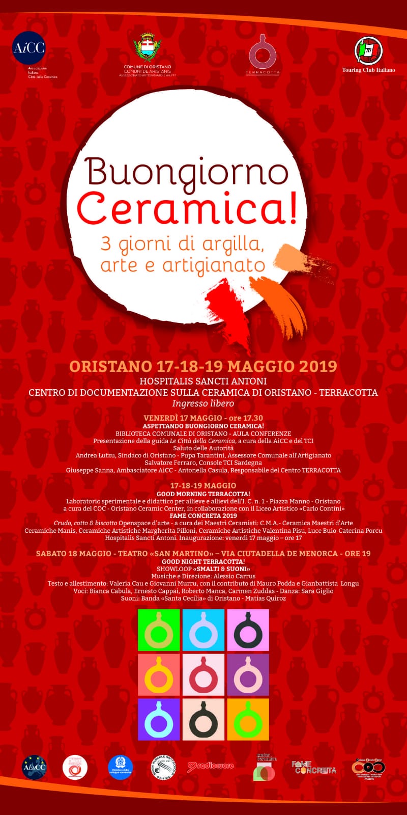 “Buongiorno Ceramica! È una felice intuizione dell’Associazione italiana delle Città della Ceramica che per il quinto anno propone un viaggio, ideale ma non solo, attraverso l’Italia del fatto a mano, delle botteghe d’arte e degli atelier d’artista, della creatività che rinnova la tradizione, degli anziani maestri e dei giovani designer – spiega l’Assessore alle attività produttive del Comune di Oristano Pupa Tarantini -. I comuni che aderiscono propongono la loro specificità, il frutto della creatività e del lavoro dei ceramisti in un viaggio che tocca piccoli centri storici e città d’arte, coinvolgendo laboratori e musei, schiudendo le porte delle gallerie contemporanee e aprendo i palazzi”.
