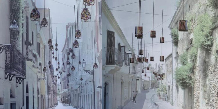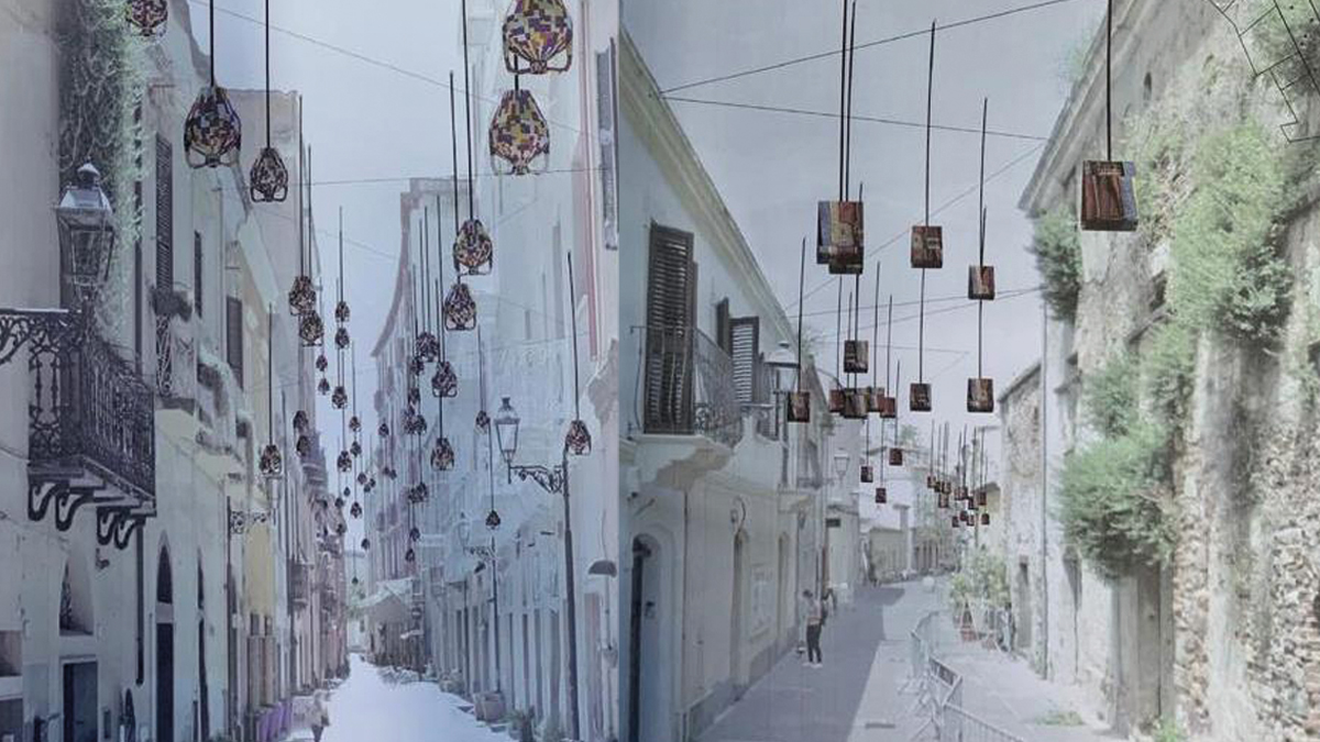 La proposta dell’architetto Zecchin prevede “la realizzazione lungo Corso Umberto I e lungo la Via de Castro di dispositivi volanti, esili e sottili. Per ciascun sito è prevista l’installazione di aste sospese che si appoggiano ad una struttura intelaiata formata da uno spartito di funi fissate ai muri degli edifici. Sulla sommità dell’asta sarà integrata una illuminazione al led dotata di micro-caricatore fotovoltaico integrato. All’estremità inferiore di ciascuna asta saranno fissati “oggetti cari” identitari legati alle tematiche culturali/territoriali”.