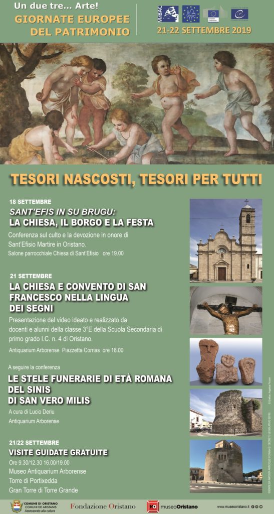 Riprendendo il tema di quest’anno delle Giornate Europee del Patrimonio, “Tesori nascosti, Tesori per Tutti”, all’Antiquarium verrà presentato l’interessante video realizzato nella Lingua dei Segni dagli alunni e dai docenti della Classe 3E della Scuola Secondaria di I Grado dell’Istituto Comprensivo 4 di Oristano.