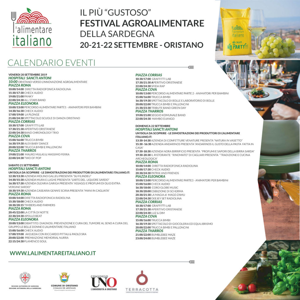 “Sarà una grande festa dell’agroalimentare, la più grande e interessante della Sardegna – spiega Tomaso Comida, patron dell’Alimentare Italiano e organizzatore del festival -. Ci saranno 50 eventi, 12/13 al giorno in ognuna delle piazze coinvolte. Vogliamo che Oristano, che è già leader regionale dell’agroalimentare, diventi un faro del settore anche a livello nazionale”.