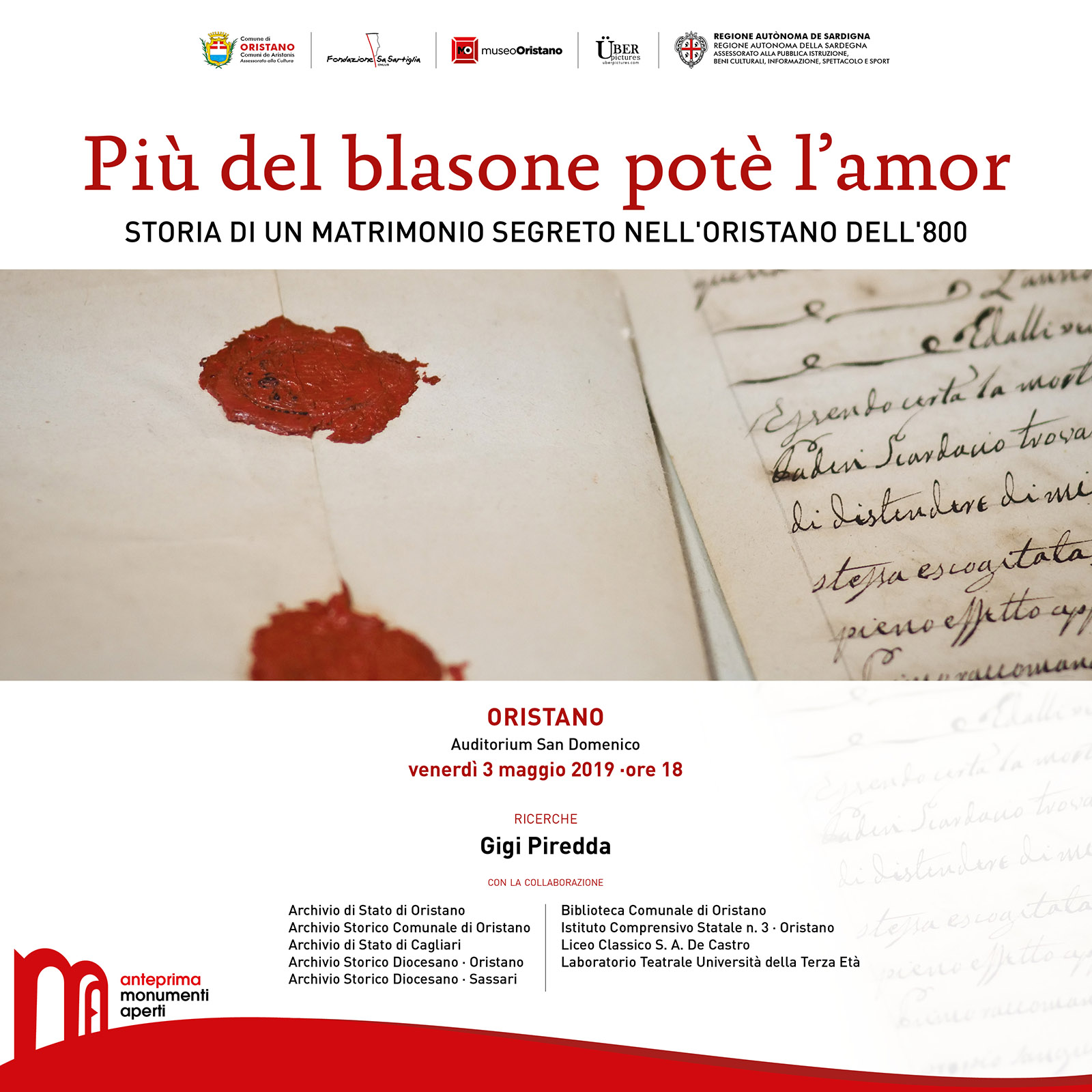 L’Assessorato alla Cultura del Comune di Oristano e la Fondazione Sa Sartiglia Onlus, che in città organizzano Monumenti Aperti sin dalla sua prima edizione, arricchisce anche quest’anno il programma della nutrita manifestazione, con un’inedita anticipazione. L’evento, tra riduzione teatrale e proiezione video, prende spunto dalle ricerche dello studioso oristanese Gigi Piredda che, partendo dai documenti d’archivio, ha ricostruito un interessante storia d’amore della Oristano dell’Ottocento.