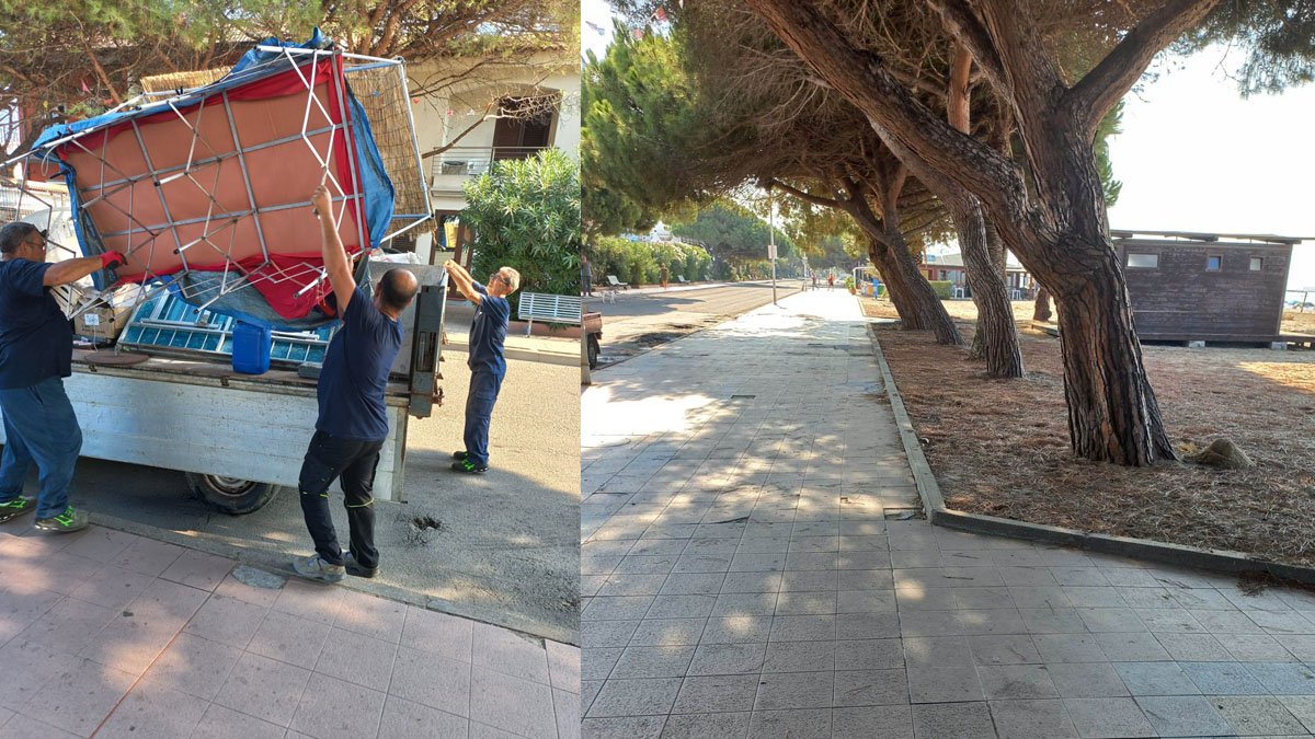 Sette agenti della Polizia locale e quattro operatori del Cantiere comunale, dopo l’ultimo sopralluogo effettuato ieri dall’Assessore Zedda e dal Comandante della Polizia locale Gianni Uras, questa mattina hanno fatto scattare i sequestri del materiale presente sul lungomare, dal chiosco di Eolo sino a Villa Baldino. Il materiale è stato caricato sui furgoni e trasportato al Cantiere comunale.