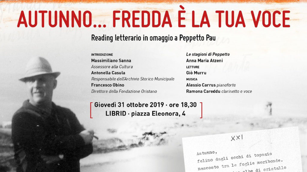 Questa edizione della rassegna ha dedicato un’attenzione particolare a uno dei personaggi più cari a Oristano: Peppetto Pau. Così, la chiusura di oggi (giovedì 31 ottobre), alle 18:30, su iniziativa dell’Archivio Storico Comunale e della Fondazione Oristano, al Librid in piazza Eleonora una serata dedicata al poeta oristanese.