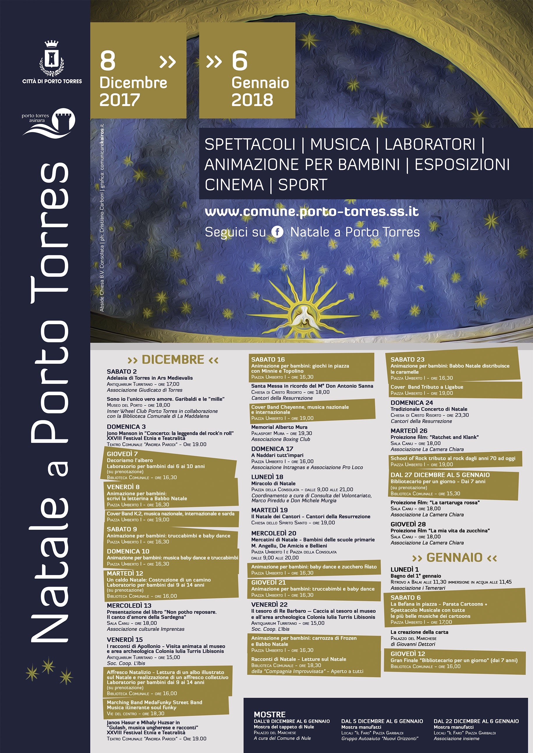 Il cartellone del Natale è caratterizzato quest’anno anche da un nuovo format comunicativo. “Abbiamo voluto trasmettere la nostra identità culturale attraverso il patrimonio monumentale. Per il materiale promozionale cartaceo e digitale – ha aggiunto l’Assessora alla Cultura, Alessandra Vetrano – è stata scelta, infatti, l’immagine del dipinto impresso sulla volta dell’abside della Chiesa della Consolata, in grado di evocare perfettamente sia il Natale sia le bellezze storiche della città. Il centro di Porto Torres sarà teatro di numerosi eventi. I concerti delle cover band, la musica delle marching band e le attività di animazione per i bambini prenderanno il via l’8 dicembre: si susseguiranno, sempre differenti, nei fine settimana dello stesso mese e nei giorni che precedono il Natale. Le attività d’intrattenimento cominceranno nel pomeriggio e proseguiranno fino all’ora di cena, per incentivare anche la presenza delle persone nelle vie dello shopping. Ci saranno, inoltre, laboratori per i bimbi in biblioteca organizzati dalla cooperativa Comes e nel museo Antiquarium Turritano a cura della cooperativa L’Ibis, le proiezioni di film per i più piccoli nella Sala Canu a cura de La Camera Chiara e tanti altri eventi culturali per tutti”.