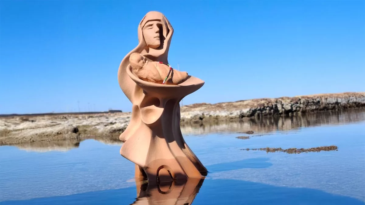 Il titolo dell’opera, “Amargura”, riprende un termine sardo che significa “amarezza” ed è anche il nome dell’album e del brano pubblicato nel 2025 dalla cantante Elena Ledda. La scultura raffigura una madre immersa per metà in una pozza d’acqua, rappresentata da un frammento di specchio deformato: la figura emerge dalla superficie riflettendo la propria immagine, mentre stringe tra le braccia la sua “vita spezzata”. Un gesto che traduce in forma visiva la perdita, la sofferenza e la resistenza di chi vive la guerra da vittima.