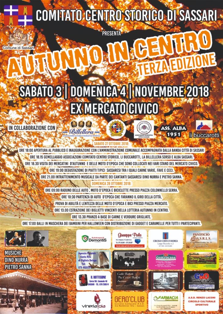 Si inizia sabato 3 novembre alle 18, con l’inaugurazione a cui parteciperà anche l’Amministrazione comunale. A seguire visita dei mercatini d’autunno e delle moto d’epoca; dalle 19 degustazione di piatti tipici sassaresi come carne, fave e ceci e dalle 21 al via la musica con i cantanti Dino Nurra e Pietro Sanna.