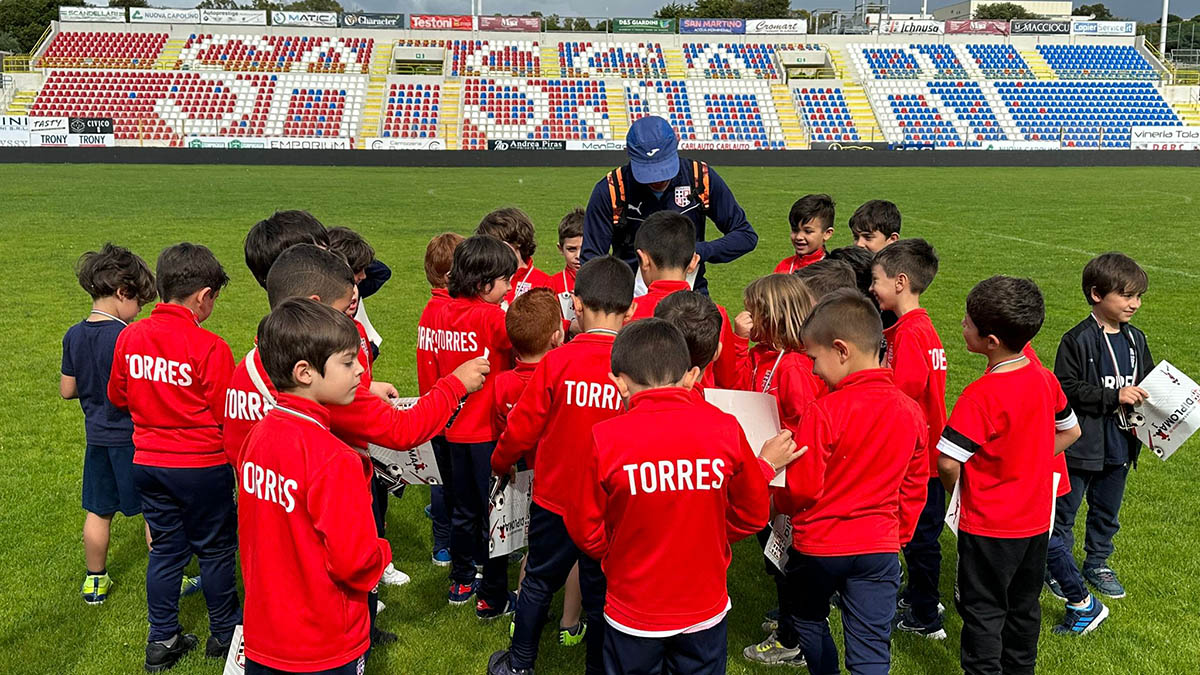 Lo speaker saluta tutti: è il giorno della premiazione, della festa di fine anno dei bimbi e delle bimbe della Scuola Calcio. A bordo campo c’è il responsabile Sergio Dossena e c’è il coordinatore Marino Vasselli. Ci sono anche il presidente della Torres Stefano Udassi e c’è Pier Luigi Pinna della proprietà Abinsula. Ci sono anche Andrea e Bruno, che per l’occasione “dirigono il traffico” in uscita dal tunnel, e c’è lo staff comunicazione a raccontare questa bella storia.