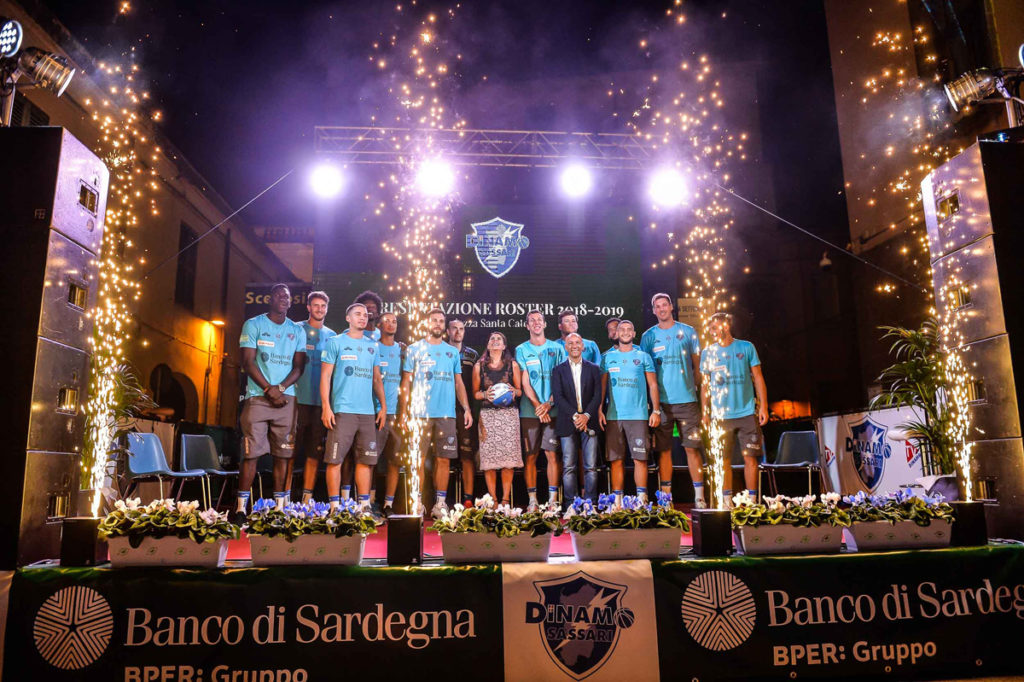 Dinamo Banco di Sardegna formato 2018/2019. È il momento di presentare la squadra che sarà protagonista in questa intensa stagione tra campionato LBA e Fiba Europe Cup. Sul palco l’amministratore delegato Renato Nicolai e il team manager Luca Rossini. Spazio dunque allo staff tecnico: primo a salire sul palco accolto da un lungo applauso è coach Vincenzo Esposito al debutto sulla panchina sassarese. Insieme a lui gli assistant coach Edoardo Casalone e Giorgio Gerosa, il preparatore fisico Matteo Boccolini. Accompagnati da un video presentazione proiettato sul megaschermo fanno il loro ingresso i giocatori: a partire dal veterano della squadra, il capitano Jack Devecchi, alla stagione numero 13 in maglia Dinamo Banco di Sardegna, record della massima serie, poi Ousmane Diop, Terran Petteway, Daniele Magro, il giovane Marco Antonio Re, quindi Achille Polonara, Scott Bamforth, Marco Spissu, Jaime Smith, Jack Cooley, Rashawn Thomas e Stefano Gentile. Unico assente giustificato l’ala statunitense Dyshawn Pierre, impegnato con la nazionale canadese: sul maxischermo è stato proiettato il videosaluto del numero 21.
