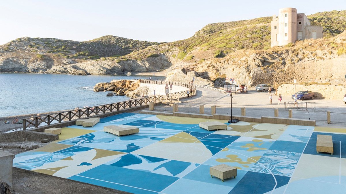 Completa questa arena naturale un’opera d’arte pubblica progettata e realizzata con gli artisti Tellas (Fabio Schirru) e 2bleene (Natalia Nicole Rodriguez) già coinvolti nel 2022 per la riqualificazione della Scala. Come una quinta teatrale dipinta a pavimento e a parete nelle tonalità del blu e dell’ocra, l’intervento artistico unisce idealmente mare, terra e cielo e incornicia e delimita lo spazio dedicato alle attività culturali e sportive. L’opera da una parte enfatizza le geometrie degli ex magazzini, un tempo destinati allo stoccaggio dei materiali della miniera, dall’altra traccia le linee e i confini dei campi da basket, pallavolo e pickleball, riportando al centro il gioco come principio di comunità e socialità.