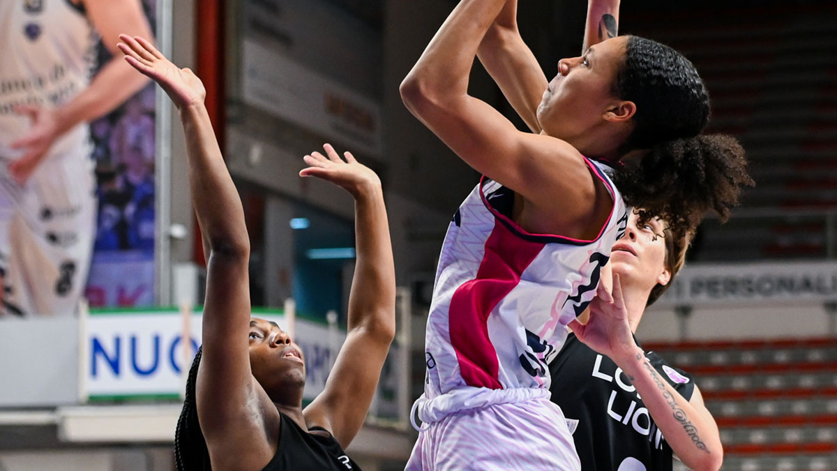Sale di colpi la partita, Carangelo prova a spingere la Dinamo che però continua a non trovare una protagonista offensiva che possa trascinarla. Il 28% dal campo di Sassari contro il 45% di Londra fa tutta la differenza, i 15 rimbalzi offensivi non bastano, una sontuosa Harrigan, insieme a Winterburn, confeziona il primo allungo chiave del match (35-44 al 26’). Clark usa ancora la zona 3-2, Holmes va fuori giri e si innervosisce, due triple consecutive della stessa Harrigan scavano il solco quasi definitivo (35-50 con parziale di 18-5). Nel momento più difficile, il Banco confeziona un 7-0 con un’altra tripla allo scadere del quarto, questa volta di Ciavarella che alimenta la fiammella della rimonta (42-50).