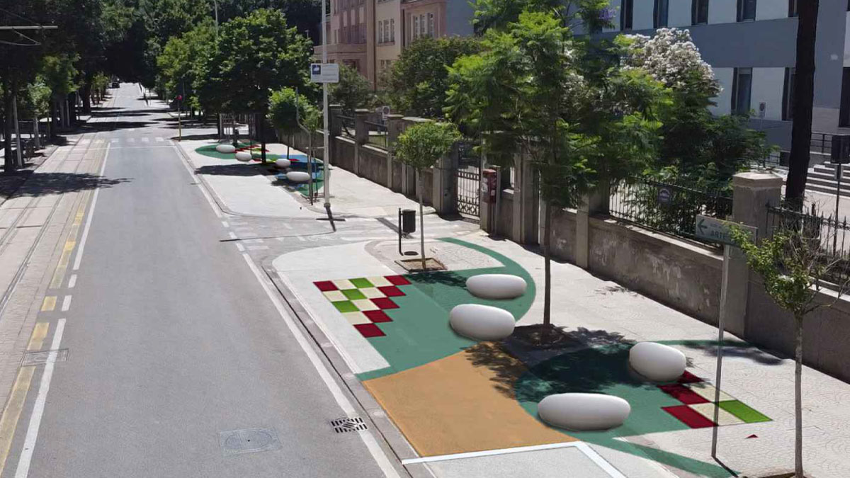 Al posto della pista ciclabile dismessa, viene realizzato un nuovo disegno della pavimentazione ispirato alle opere e alla cifra artistica di Eugenio Tavolara, a cui è dedicato il vicino padiglione per l’artigianato opera di Ubaldo Badas. La creazione artistica per la pavimentazione, realizzata in resina colorata, nasce dalla collaborazione tra l’Amministrazione comunale, lo studio di progettazione guidato dall’architetto Delogu e il liceo artistico Figari, i cui studenti hanno proposto una soluzione creativa ispirata ai dettami dell’approccio disciplinare denominato “urbanismo tattico”. «Si tratta di un modo di cambiare le città con costi contenuti e usando diversamente lo spazio, in un rapporto stretto di scambio e confronto tra amministrazioni pubbliche e cittadinanza», spiegano gli esperti che hanno affiancato i giovani artisti.