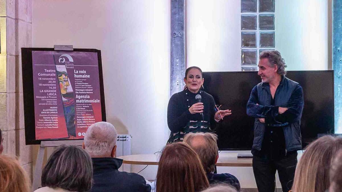 Lunghi applausi hanno accolto il soprano Paoletta Marrocu che insieme al presidente del De Carolis Antonello Mattone ha raccontato i suoi esordi a Sassari prima del grande successo internazionale e la sua esperienza di questi primi giorni di prove con il dittico. Un bel momento di teatro è stato regalato da Annunziata Vestri, che interpreta in “Agenzia matrimoniale” la barbona, e ha deliziato il pubblico con un prezioso cameo tratto dall’opera in scena al Comunale, accompagnata alla fisarmonica da Lorenzo Albanese e al piano da Francesca Tosi direttore musicale del De Carolis. Il suggestivo brano proposto ha ben evocato le atmosfere che si respireranno in teatro nelle due recite entusiasmando il pubblico presente in sala.