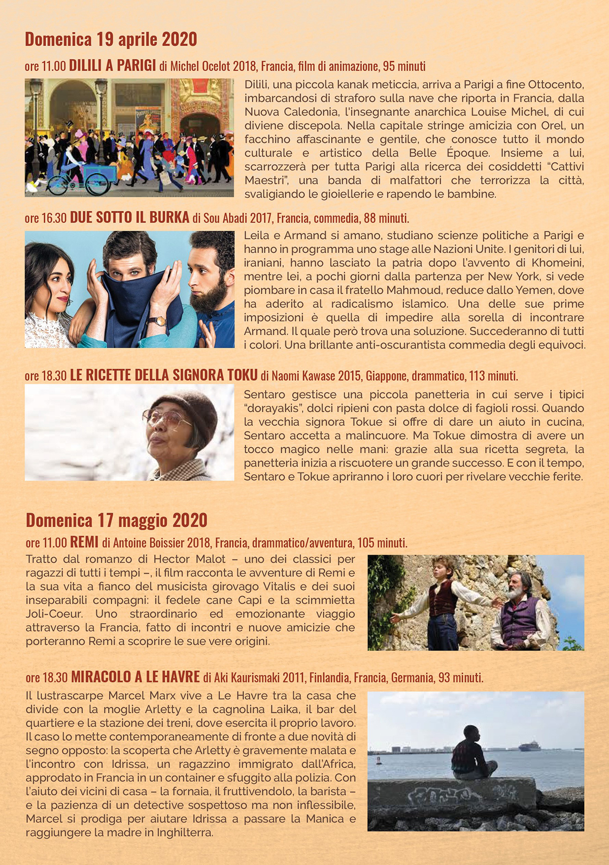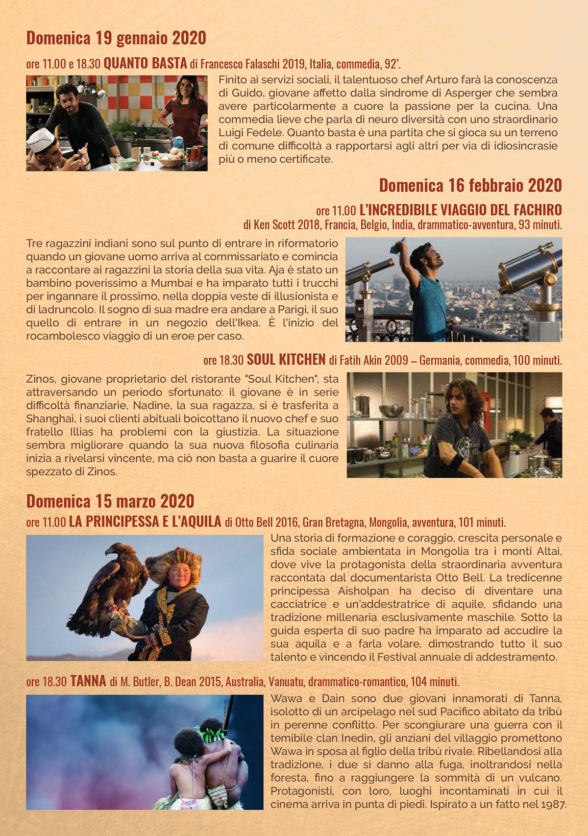 La rassegna proseguirà ogni terza domenica del mese, fino a maggio, con un doppio appuntamento mensile in un viaggio dalla Francia al Giappone, dall’Australia alla Mongolia. L’ingresso è libero. Si consiglia la prenotazione per la presenza di posti limitati telefonando ai numeri 079 230291 oppure 335 7105396.