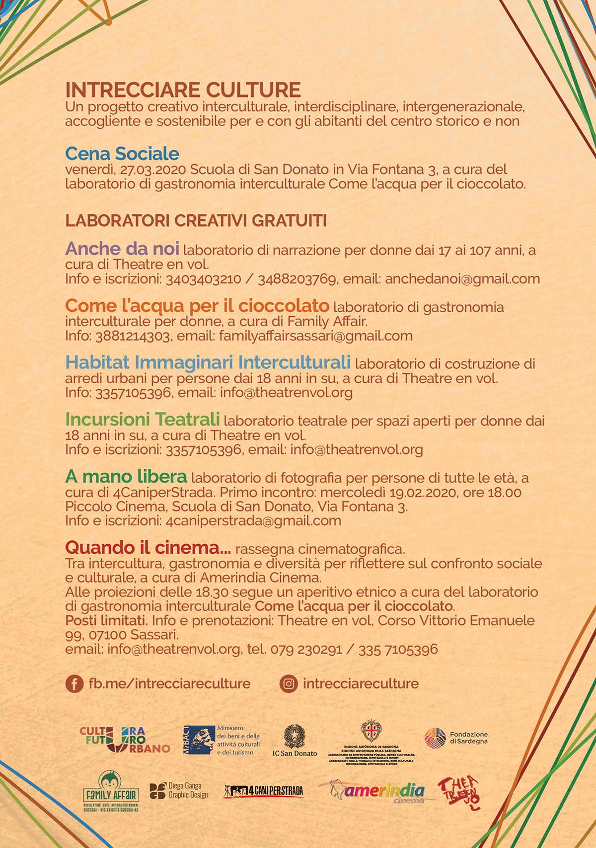 “Quando il cinema…” è inserita all’interno di Intrecciare Culture, un progetto di ampio respiro che da novembre a maggio 2020 interviene con laboratori creativi interculturali gratuiti, cene sociali, incontri di quartiere, cinema, mostre, visite guidate e presentazioni creative dei risultati dei laboratori presso l’Istituto Comprensivo San Donato e nelle vie e piazze del Centro Storico basso di Sassari.