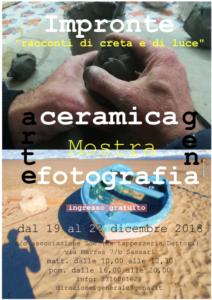 A Sassari, dal 19 al 22 dicembre, presso la sede dell’associazione culturale Zoe (ex tappezzeria Dettori) in via Marras 7/b, si terrà la mostra di ceramiche artistiche e fotografia degli ospiti del centro riabilitativo Opera Gesù Nazareno di Sassari. Sarà visitabile al mattino dalle 10:00 alle 12:30 e al pomeriggio dalle 16:00 alle 20:00, con ingresso gratuito. La mostra sarà inaugurata mercoledì 19 dicembre ore 16:00.