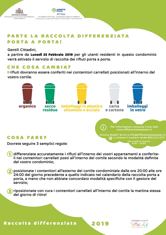 Per informazioni è possibile consultare il sito www.differenziatasassari.it, scrivere a [email protected] o chiamare il numero verde 800012572 (dal lunedì al venerdì dalle 9 alle 19).