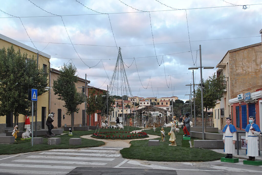 La sacra famiglia e la natività sono alla fine di un piccolo percorso che, in questa edizione, si svolge nella ristrutturata piazza Cala d’Oliva. Sul prato allestito dagli operai del Comune, sono state sistemate le statue dei pastori, con pecore e caprette, quindi ancora vitellini, gli asinelli bianchi dell’Asinara, alcuni angeli, le statue dei musicanti e quelle realizzate in onore della Confraternita della Beata Vergine della Difesa.