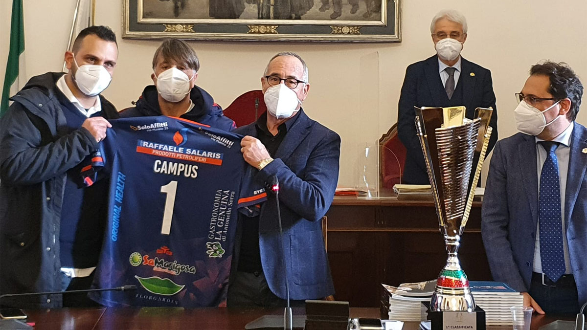 Gli atleti, con la coppa appena conquistata, hanno consegnato nelle mani del sindaco Nanni Campus la maglia della squadra con il numero 1 mentre il primo cittadino e il presidente del Consiglio Maurilio Murru hanno donato a tutti libri sui Candelieri.