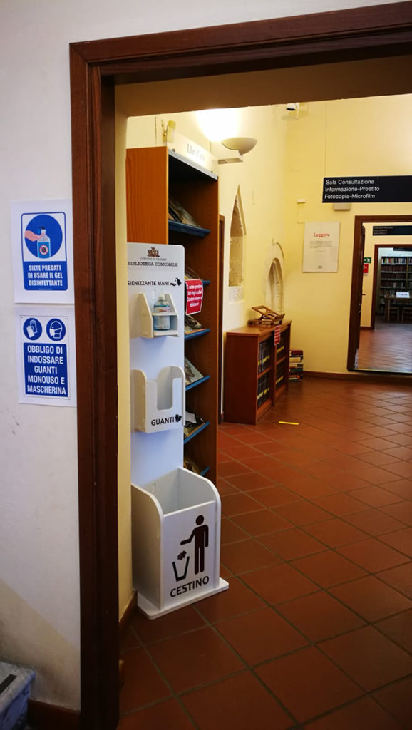 In base alla vigente normativa saranno ammessi alle biblioteche solo gli utenti con dispositivi di protezione individuale propri (mascherine e guanti), sempre nel rispetto delle precauzioni sanitarie: distanziamento e uso di mascherina, guanti e gel igienizzante.