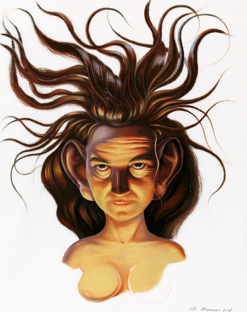 Massimo Mannu e i volti dalle grandi orecchie: “L’accrescimento di un elemento anatomico come l’orecchio può essere relazionato ad un’ottica lamarckiana: è cresciuto per esigenze di adattamento all’ambiente circostante. È cresciuto per accogliere il suono della natura: un suono stridulo, incombente, che rivela la rottura dell’armonia tra l’uomo e il cosmo. L’orecchio è un organo che ha una funzione predittiva e nel contempo rivela uno squilibrio interiore, sintomo e simbolo di una frattura, di una condizione discrasica. Sono elementi formali che costituiscono un linguaggio anticlassico. Eppure la scrittura lineare, il ductus, è legata alla grande tradizione italiana, che indubbiamente ho approfondito”.