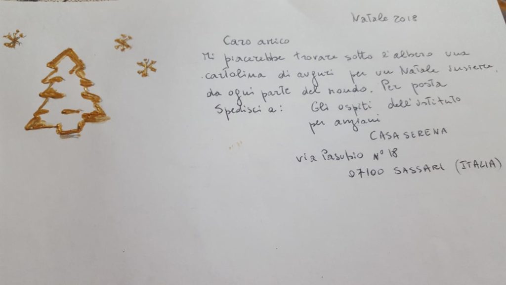 L’invito è quello di spedire, rigorosamente per posta, all’indirizzo Casa Serena, via Pasubio 18, 07100 Sassari, un biglietto da qualsiasi luogo ci si trovi, con gli auguri per gli ospiti e le ospiti della residenza per anziani.