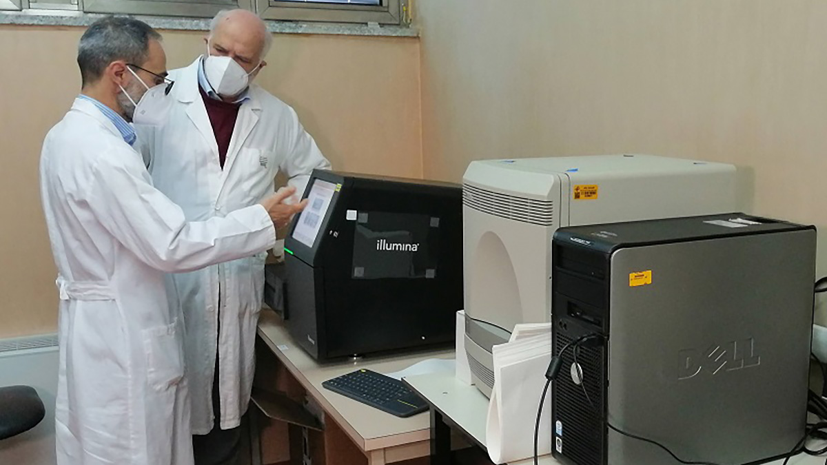 Aou Sassari: prof. Rubino e prof. Uzzau di lato al macchinario per sequenziare virus
