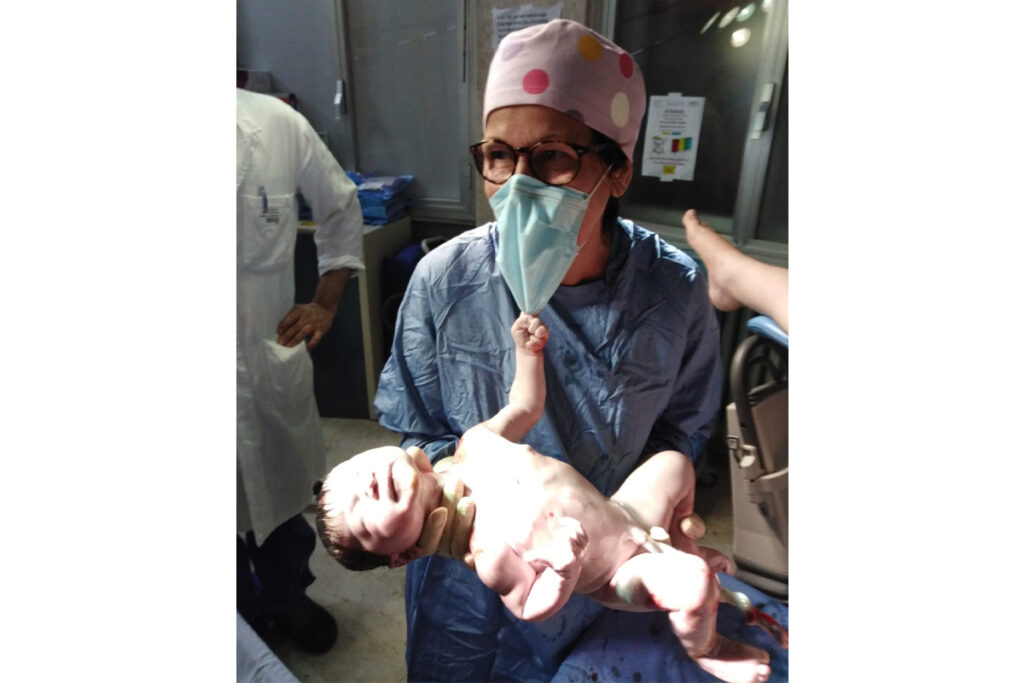 Un bambino appena nato che tira involontariamente la mascherina dell’ostetrica che lo tiene in braccio e che ha appena assistito la sua mamma in sala parto. Per il quotidiano L’Eco di Bergamo è la foto simbolo di questo Natale 2020, anche se lo scatto risale al 7 maggio scorso. A essere ritratti sono il piccolo Mattia e l’ostetrica Gianfranca Fiori, che lavora nella sala parto della Ginecologia e Ostetricia dell’Aou di Sassari.